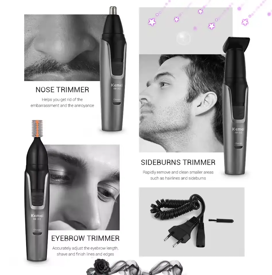KM-312 3-in-1 Nose & Ear Hair Clipper - Eyebrow & Sideburn Trimmer with Stainless Steel Blades